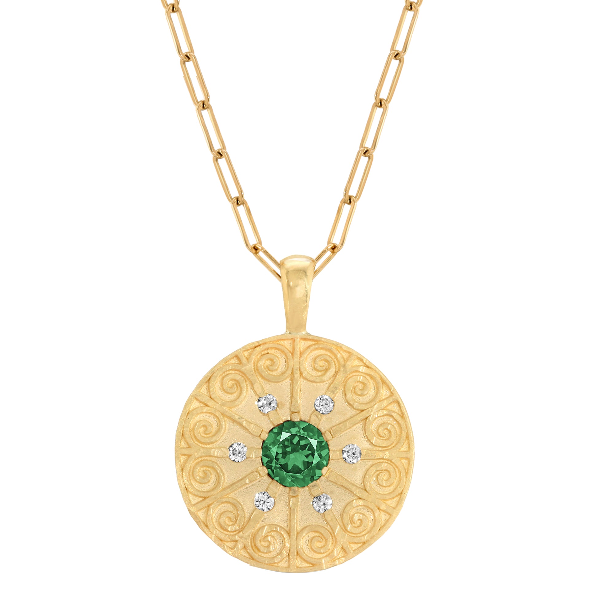 This medallion captures the essence of a tiny Spanish hill town in La Rioja, Spain. It features a beautiful diamond cut emerald and six diamonds. Each medallion is made to order and is hand finished, so each medallion is unique.