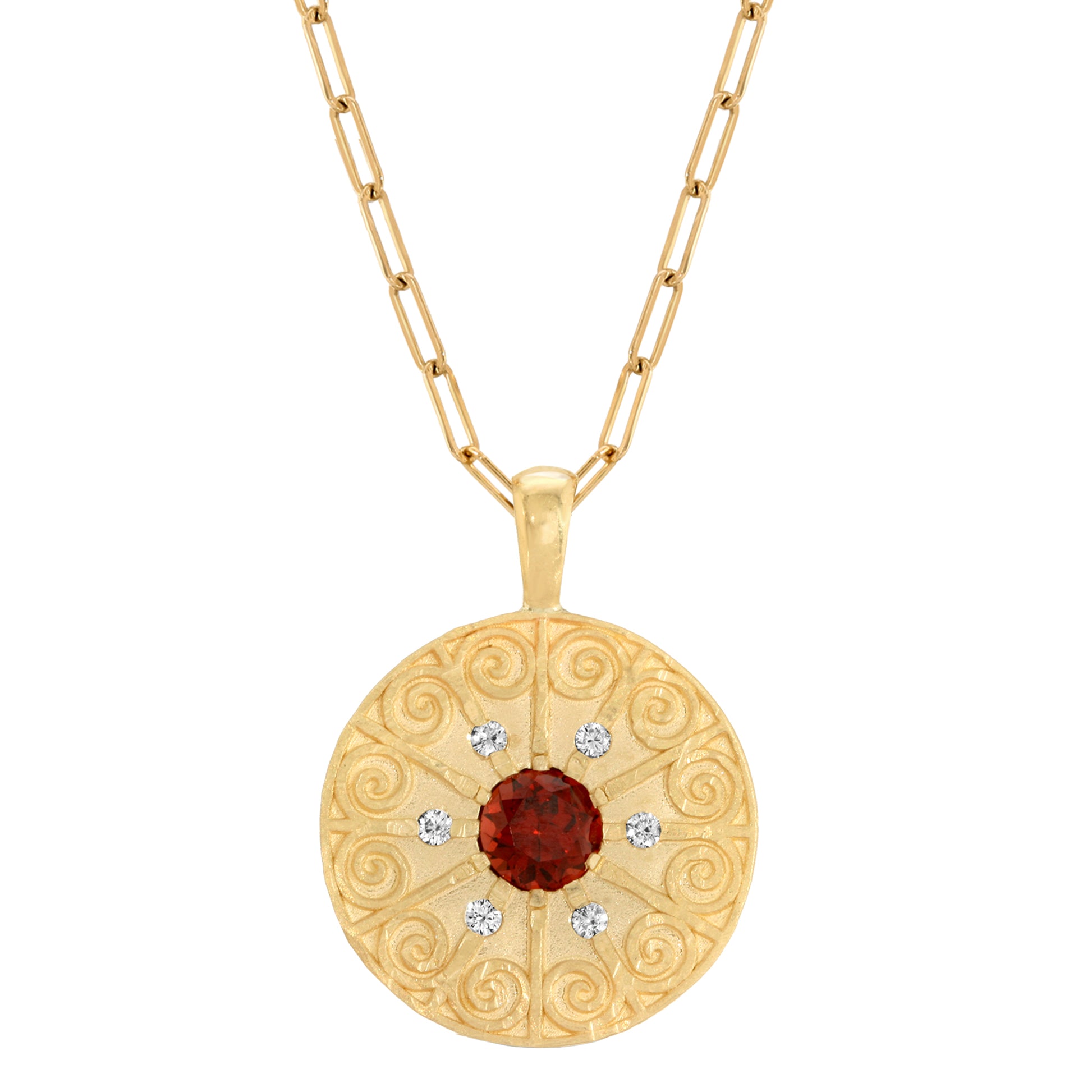 This gold medallion captures the romance and old-world charm of a tiny Spanish hill town in La Rioja, Spain. It features a deep red garnet surrounded by six diamonds. Each medallion necklace is made from recycled gold and is hand finished.