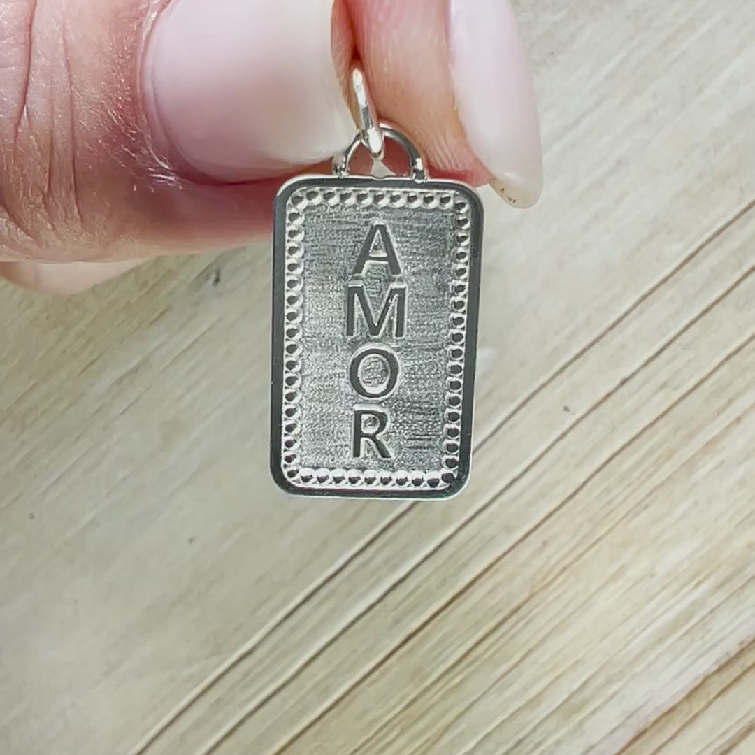 This bilingual necklace celebrates love in both English and Spanish. Handcrafted in San Diego, our charm features raised lettering on both sides. One side proudly says LOVE while the other side beautifully displays AMOR.