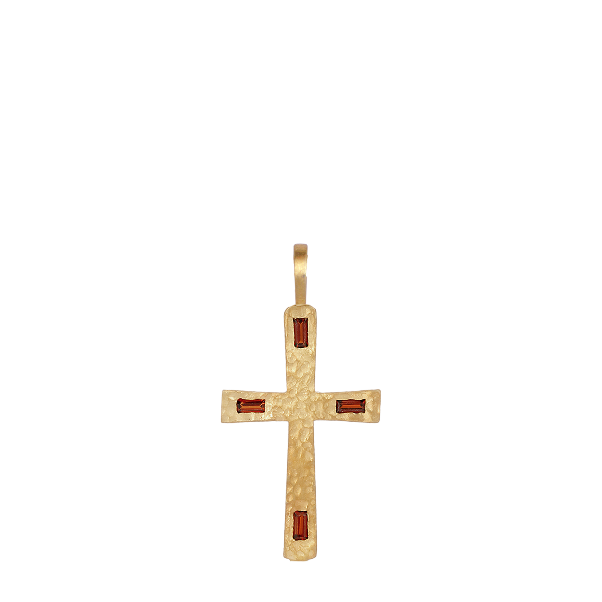 Our rustic 14k gold cross is striking with a rich garnet poised at each end.  Each cross is made to order and is hand finished by an artisan jeweler.